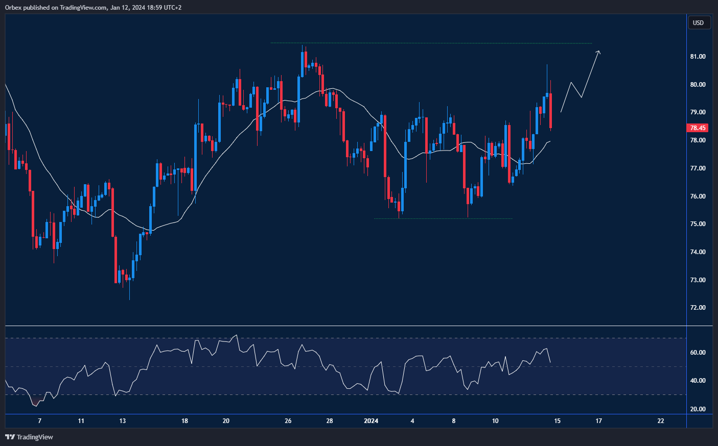 انخفض خام برنت في الجلسات الأخيرة بسبب توقعات قاتمة بشأن الطلب. وحيث تقود أوبك+ الطريق في توفير إشارات لمتداولي النفط، شهد الارتداد القوي عن القاع المزدوج عند ٧٥.٠٠ المزيد من التوجه الإيجابي نحو اتجاه صعودي في الأسعار. ومن الممكن أن يستمر عدم التوازن بين العرض والطلب في إبقاء الأسعار غير مستقرة. ومع ذلك، فإن تصاعد التوترات في البحر الأحمر يمكن أن يؤدي إلى ارتفاع حاد في المدى القصير. ويتعين تجاوز المستوى ٧٩.٥٠ أولا، كي يعاد اختبار قمة ديسمبر أعلى ٨١.