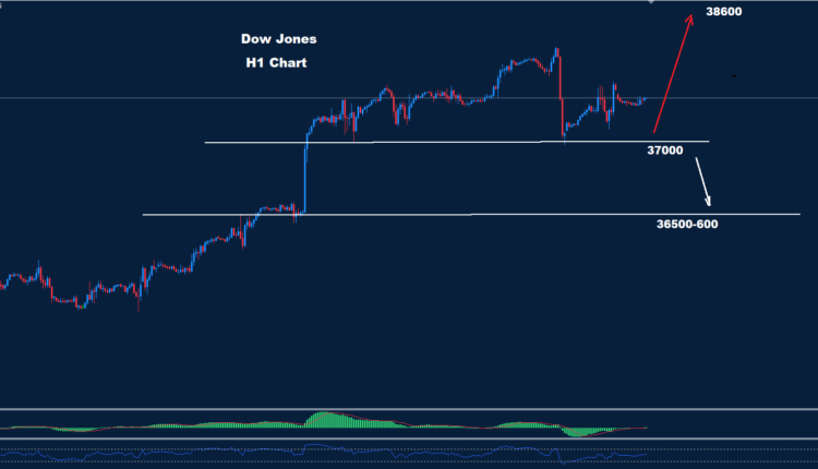 تمكن مؤشر داو جونز من الاحتفاظ بتداولاته فوق مستوى الدعم 37000 حيث تمكن من استئناف التقدم نحو 37800 حتى الآن.
