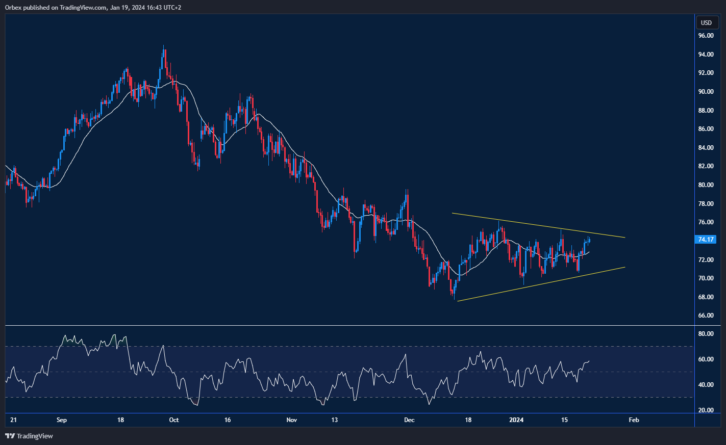 يبقى خام غرب تكساس الوسيط ضمن مثلث متماثل بعد فقدان الثقة مع دخول العام الجديد. ولم يدم الإغلاق أعلى المستوى القمة السابقة عند ٧٣.٠٠ طويلاً، حيث واجه الارتفاع مقاومة عند ٧٤.١٥. وقد يجبر الهبوط دون ٧٢.٦٥ المشترين أصحاب الرافعة المالية على الانسحاب. ولكن لا يزال هناك إمكانية لحدوث تصحيح بعد أن يشير تباين مؤشر القوة النسبية السلبي إلى انحسار الزخم. وشهد المستوى ٧٥.٠٠ حيث المتوسط المتحرك لمدة ٢٠ يوماً تجدد الطلب. وسيمثل ٧٦.٠٠ خط دفاع الثاني للمشترين.
