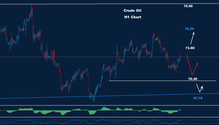 كما نرى على الرسم البياني، لا يزال لدى النفط الخام فرصة لمزيد من الانخفاض نحو 70.30 أو 67.70 طالما استمر السوق في الحفاظ على تداولاته تحت مستوى المقاومة 73.90 حيث قد يدفع أحد هذين الدعمين نحو تقدم آخر.
