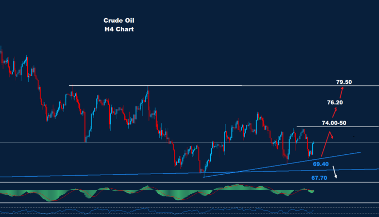 تمكن النفط من إضافة المزيد من الحركة التصحيحية الهابطة، فيما لا تزال توقعاتنا لموجة صاعدة قادمة قد تستهدف مستويات 76.20 و79.50.