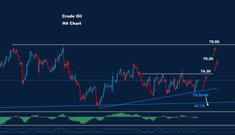 مازلنا متمسكين بتوقعاتنا السابقة بأن النفط الخام لا يزال يبني موجة صعود نحو مستوى 79.50.