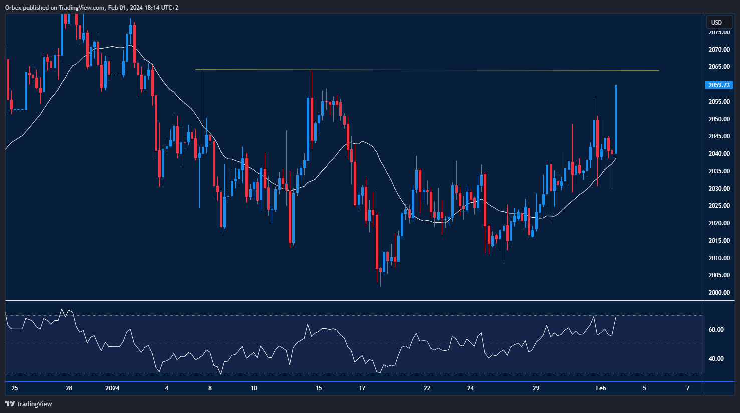 على الرغم من ارتفاع الدولار بعد قرار البنك المركزي، ارتفع الذهب بواقع ٢٠ دولاراً. لتبقى الأسعار ضمن نطاق المكاسب الأخيرة التي امتدت إلى مستوى المقاومة ٢٠٦٠، وهي أعلى مستوى له في أسبوعين. وسيبدأ المعدن الأصفر في اختبار قمة ثلاثية محتملة إذا لم يظهر إشارات تراجع. وفي حال نجحت الاسعار في تجاوز ٢٠٦٥، سوف يفتح المجال لاختبار ٢٠٨٨. بيد إن مؤشر القوة النسبية المتوغل في منطقة ذروة الشراء قد يتسبب بانخفاض مؤقت نصوب ٢٠٤٥، حيث يبحث المشترين عن الدعم عند ٢٠٣٠.