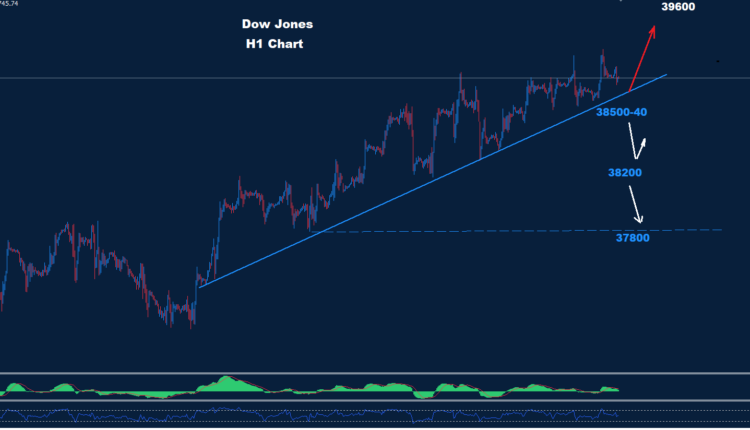 تمكن مؤشر داو جونز من الحفاظ على التداولات فوق منطقة الدعم 300-38200 بينما تمكن أمس من الوصول إلى مستويات 38925 مقترباً من أهداف 39000.
