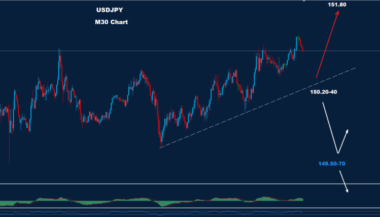 ما زلنا متمسكين بتوقعاتنا السابقة للدولار الأميركي مقابل الين الياباني حيث لا تزال موجة الاتجاه الصعودي مستمرة نحو الهدف 151.80.