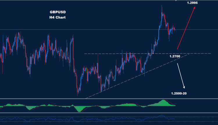 كما نرى على الرسم البياني، لا يزال السوق يواجه منطقة دعم حول 1.2700 حيث طالما استمر السوق في الحفاظ على التداولات فوقها فإن الموجة المتقدمة ستستمر نحو 1.2995.