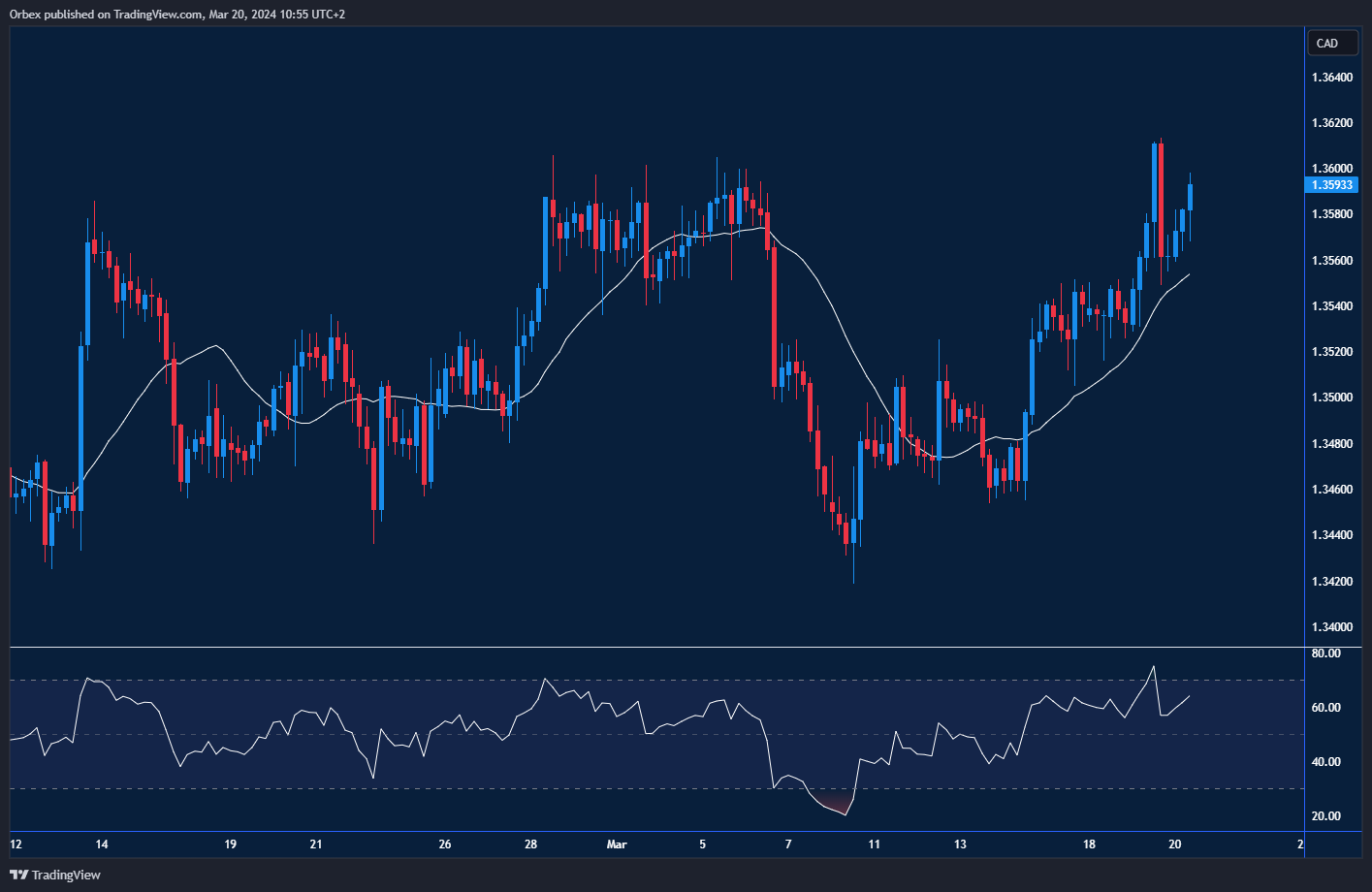 تراجعت قيمة الدولار الكندي أمام جاره الأمريكي بعد نتائج التضخم المتباينة. ومع انخفاض الزوج بأكثر من ٦٠ نقطة، يسترد الدولار الأمريكي خسائره التي تكبدها حيث يحاول من جديد الاقتراب من ١.٣٦١٠. ولا يزال التحيز لصالح الارتفاع قائمًا على الرسم البياني، مع عمليات شراء قوية أعلى ١.٣٥٦٠ حيث التقاء المتوسط المتحرك لمدى ٢٠ يومًا. وسيستأنف الاتجاه الصاعد أعلى القمة الأخيرة في حال الإغلاق أعلى ١.٣٦٠٠، واقتراب مؤشر القوة النسبية من المنطقة المحايدة.