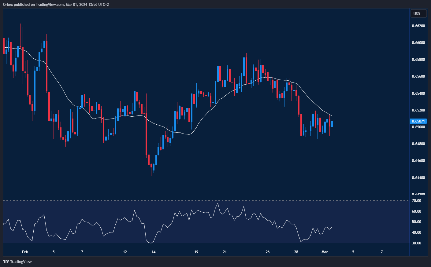 اكتسب الدولار الأسترالي زخماً مقابل نظيره الأمريكي بعد أن أوقفت بيانات مبيعات التجزئة التراجع الأخير. ويبدو أن حركة السعر قد اكتسب قاعدة آمنة في منطقة التوطيد المحصورة بين ٠.٦٤٨٠ و٠.٦٥٢٨ بالقرب من أدني مستويات التذبذب الأخير. وهي منطقة هامة للمشترين للدفاع وحماية الاتجاه الصاعد، حيث أن كسره يفتح المجال لهبوط الزوج إلى ٠.٦٤٣٥. ومن منظور الرسم البياني للساعة، يمثل المستوى ٠.٦٥٥٠ أول مقاومة أمام الارتفاع، والتي سيقلص اختراقها من ضغط البيع. وهناك عوائق تمنع ارتفاع الزوج على ما يبدو للارتفاع نحو ٠.٦٦٢٠، ولكن سيتسع نطاق التعافي مع تخطيه.