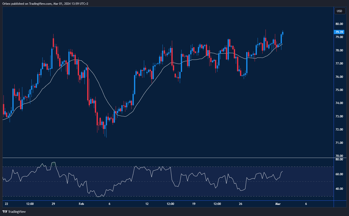 ارتفع خام غرب تكساس الوسيط بشكل أكبر بدعم من التوقعات بشأن تزايد الطلب لعام ٢٠٢٤ التي لازالت متفائلة. وعلى الرسم البياني، تجاوز السعر مؤخرًا المقاومة الأخيرة عند ٧٩.٠٠. وسيجبر تجاوز ٧٩.٥٠ البائعين على الانسحاب ويضع الأساس لموجة ارتفاع أخرى، مع تعيين ٨٠.٠٠ كهدف تالي. أما ٧٨.١٠، فهو الدعم الذي سيتم عنده قوة عروض المتابعة في حال تراجع السعر، و يعد ٧٧.٠٠ مستوى دعم حاسم يتوجب صموده للحفاظ على التحيز الإيجابي قائمًا على المدى القريب.