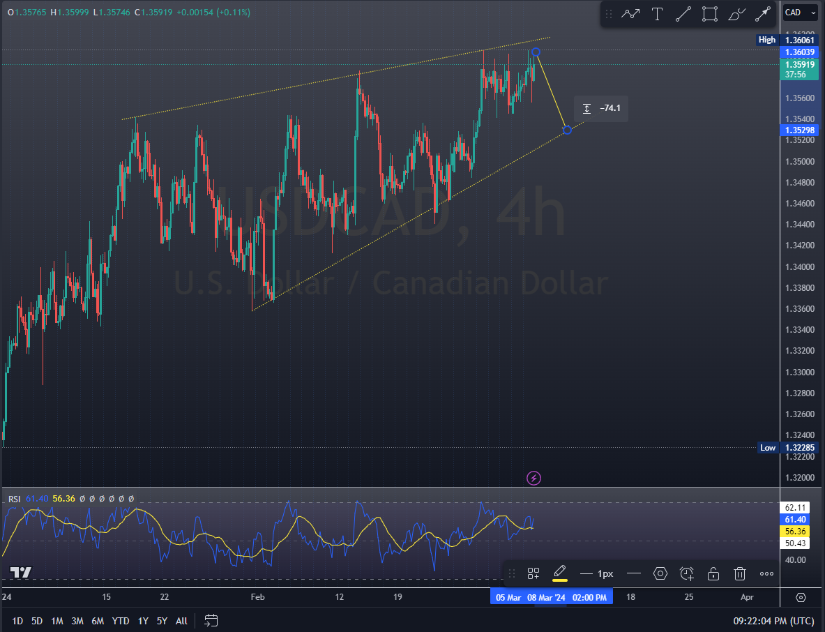 يجري تداول الزوج الدولار/كندي داخل نموذج وتد صاعد على الإطار الزمني 4 ساعات، ومن المتوقع أنه في حال فشل الزوج في اختراق مستوى المقاومة 1.36 فمن المتوقع هبوط الزوج بما يقرب من 72 نقطة قرابة الحد السفلي للنموذج قرابة 1.3530. وفي حال كسر هذا المستوى فمن المتوقع مواصلة الهبوط إلى مستوى الدعم التالي قرابة المستوى 1.3429.
