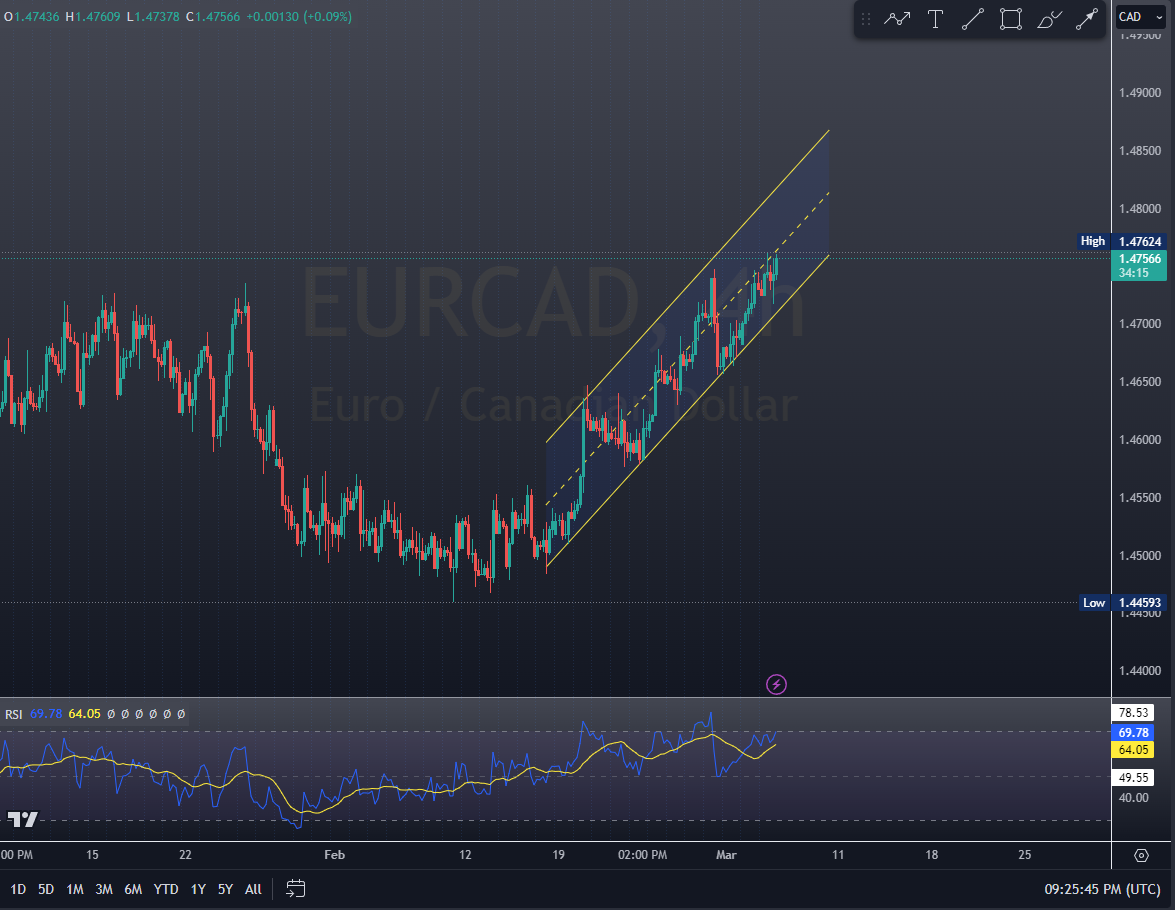 يجري تداول الزوج داخل قناة سعرية صاعدة على الإطار الزمني 4 ساعات ومن المتوقع أن يواصل الزوج ارتفاعه إلى الحد العلوي للقناة في حال استقرار تداولات الزوج أعلى المستوى 1.4715 باستهداف المستوى 1.48 ويتم استغلال أي تراجعات للشراء بشرط استقرار تداولات الزوج داخل القناة السعرية.