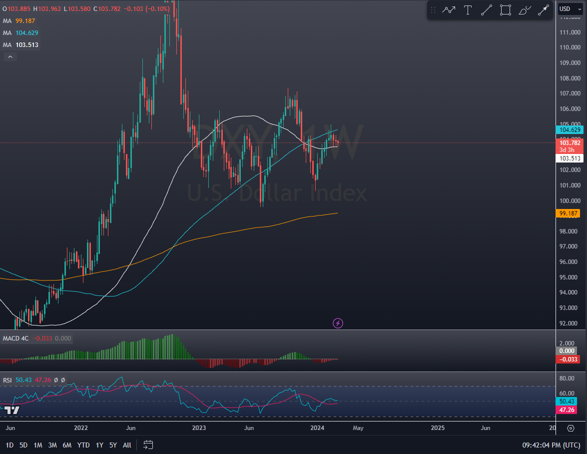 وتظل النظرة السلبية قائمة ما لم يعود للتداول أعلى المستوى 105.00 وقد تزداد الضغوط البيعية على الدولار في حال كسر المستوى 103.40 والمتمثل أيضاً في المتوسط المتحرك لإغلاق 50 أسبوع باستهداف مستويات 102.