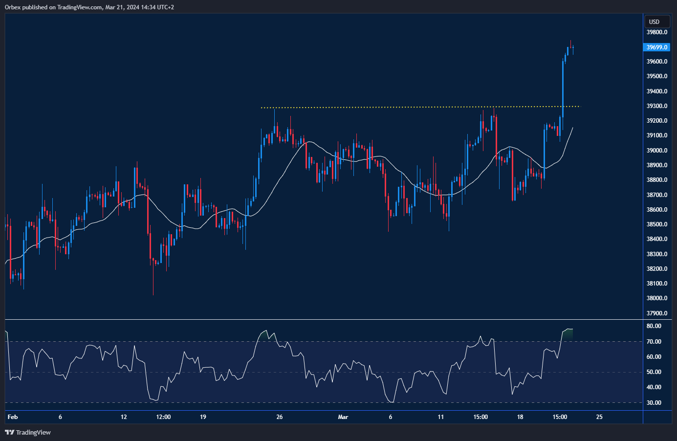 ارتفع مؤشر “داو جونز ٣٠” على خلفية التوقعات الاقتصادية للجنة الفيدرالية للسوق المفتوحة. ويشير اختراق مستوى المقاومة الأخير عند ٣٩٣٠٠ إلى سيطرة المشترين بقوة على الاتجاه. ولكن مخاوف حدوث انعكاس تبقى قائمة، وسيمثل ٣٩٦٠٠ أول المستويات التي سيتم اختبارها في حال تراجع المؤشر. كما سيدفع كسر مقنع للمستوى ٣٩٤٥٠ المشترين إلى تغطية مراكزهم ويساعد البائعين على استعادة السيطرة على الاتجاه. وسوف يستأنف الاتجاه الصاعد في حال إغلاق المؤشر أعلى ٣٩٧٥٠.
