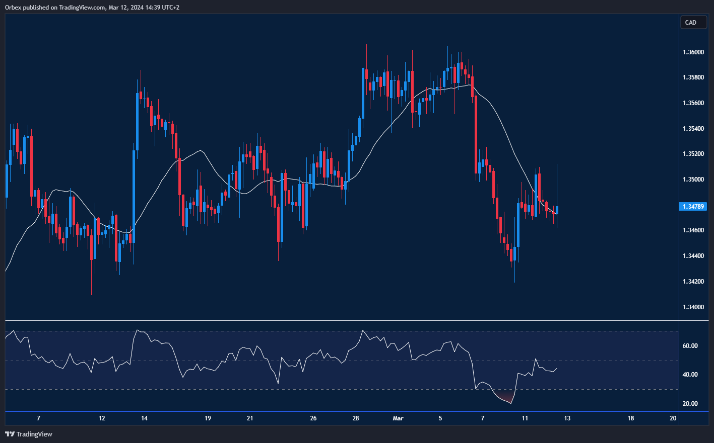 انخفض الدولار الكندي نتيجة لبيانات التضخم التي كانت العامل الأساسي الرئيسي في السوق بشكل عام. ليرتفع سعر صرف الدولار الأمريكي مقابل جاره الكندي، لمستوى ١.٣٥٠٠، حيث أن تزامن وجود مؤشر القوة النسبية الموجود في منطقة ذروة البيع والتباين السلبي، يعكسان حاجة الزوج للتصحيح. ووفقًا الاتجاه العام، سيتطلع البائعين للهبوط بالزوج دون الدعم الأول ١.٣٤٦٠، والذي سيفتح كسره الباب أمام المزيد من الهبوط نحو ١.٢٤٢٠ وتسجيل قاع شهري جديد.