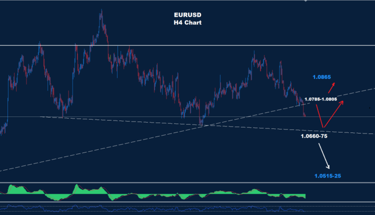 تمكن اليورو من التراجع و الهبوط تحت ترند الدعم 1.0760 مما قد يدفع لمزيد من الحركة الهبوطية