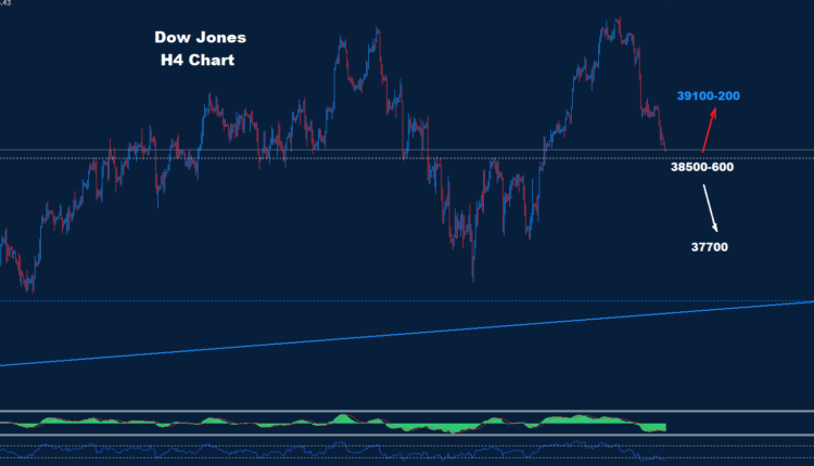 تمكن مؤشر داو جونز من الهبوط إلى ما دون مستوى الدعم 600-38500 مما قد يضع المزيد من الضغط الهبوطي على السوق للتوجه نحو منطقة 37700