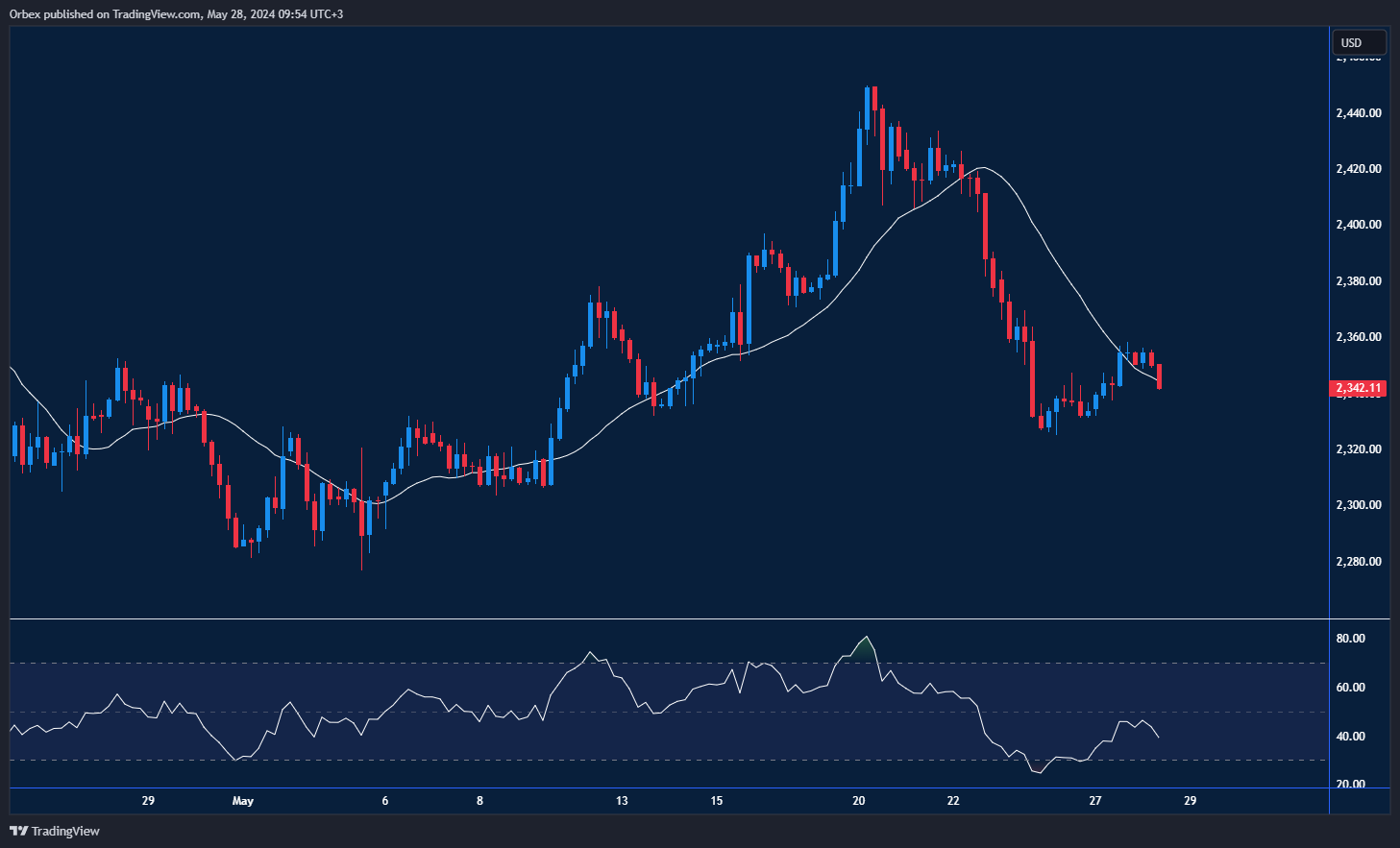 شهد الذهب حركة تصحيح بعد بلوغه منطقة ذروة البيع حيث اقتربت الأسعار من مستوى ٢٣٠٠ دولار. ويختبر المعدن منطقة ١٣٣٥ بقرب قاعدة الارتفاع السابق. وفي ضوء سعر الذهب اليوم، ويعد الارتداد الأولي إشارة على جني البائعين على المدى القصير للأرباح في هذ المنطقة الهامة، مما قد يسهم في تقليص الضغط السلبي. وفيما يمثل السعر ٢٣٦٠ أقرب مقاومة، يتعين تجاوز المستوي ٢٣٨٥ لتحقيق قمم جديدة. وفي المقابل، فإن كسر مستوى ٢٣٢٠ قد يؤدي إلي تجدد عمليات البيع وتراجع السعر لاختبار مستوى منخفض جديد لم يصل إليه الذهب منذ عدة أسابيع.