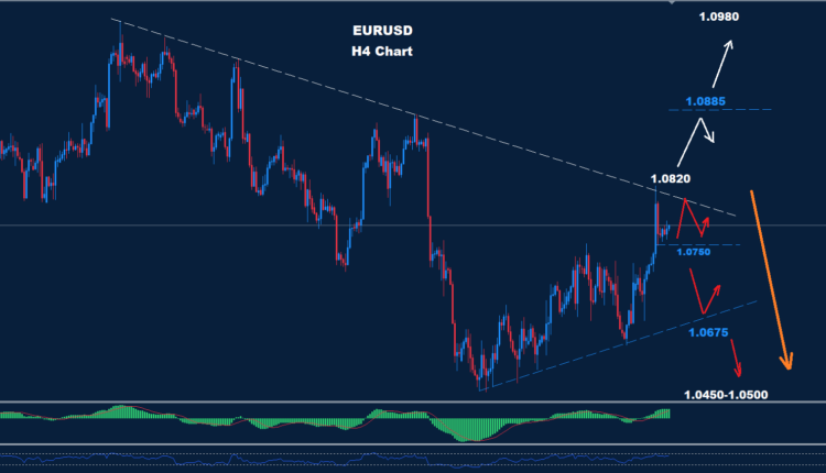 تحت 1.0750 من المتوقع المزيد من الانخفاض حيث يقع الدعم الثاني عند 1.0675 مما قد يوفر بعض التصحيح الارتدادي