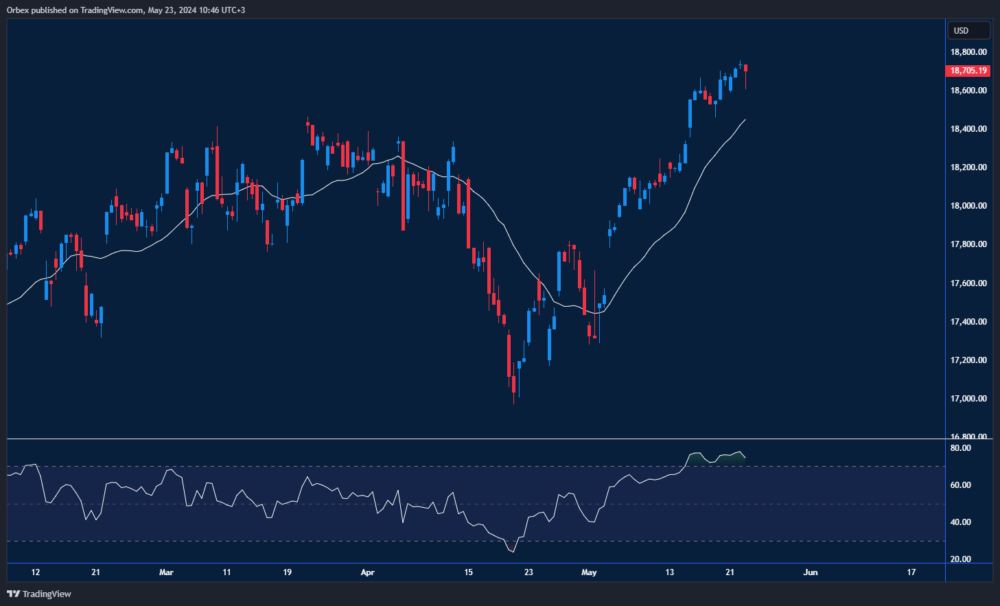 سجل مؤشر ناسداك ارتفاعًا جديدًا حيث اندفع المستثمرون نحو أسهم شركة إنڤيديا والأسهم المتعلقة بالذكاء الاصطناعي. ويشير الارتفاع فوق مستوى المقاومة عند ١٨٤٠٠ إلى وجود اهتمام قوي بالشراء فيما يكافح البائعين لاحتواء الارتداد. وعلى الرغم من أن حركة السعر على مدار الساعة قد تكون متقلبة، إلا أن التحيز لا يزال لصالح الارتفاع. ويعتبر مستوى ١٨٠٠٠ الآن دعم جديد، وإذا نجح المؤشر في الإغلاق أعلي المستوى ١٩٠٠٠، فقد يدفع ذلك الأسعار نحو المستوى ١٩٤٠٠.