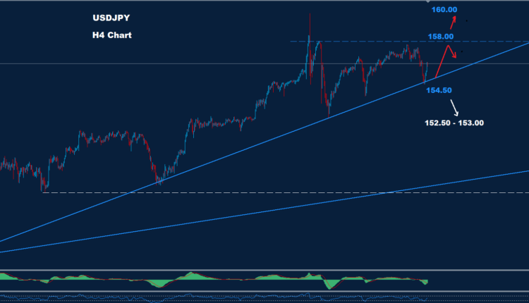 طالما أن السوق يحتفظ بالتداولات فوق 154.50 فإن موجة الصعود قد تستمر نحو مستويات 158.00 و 160.00