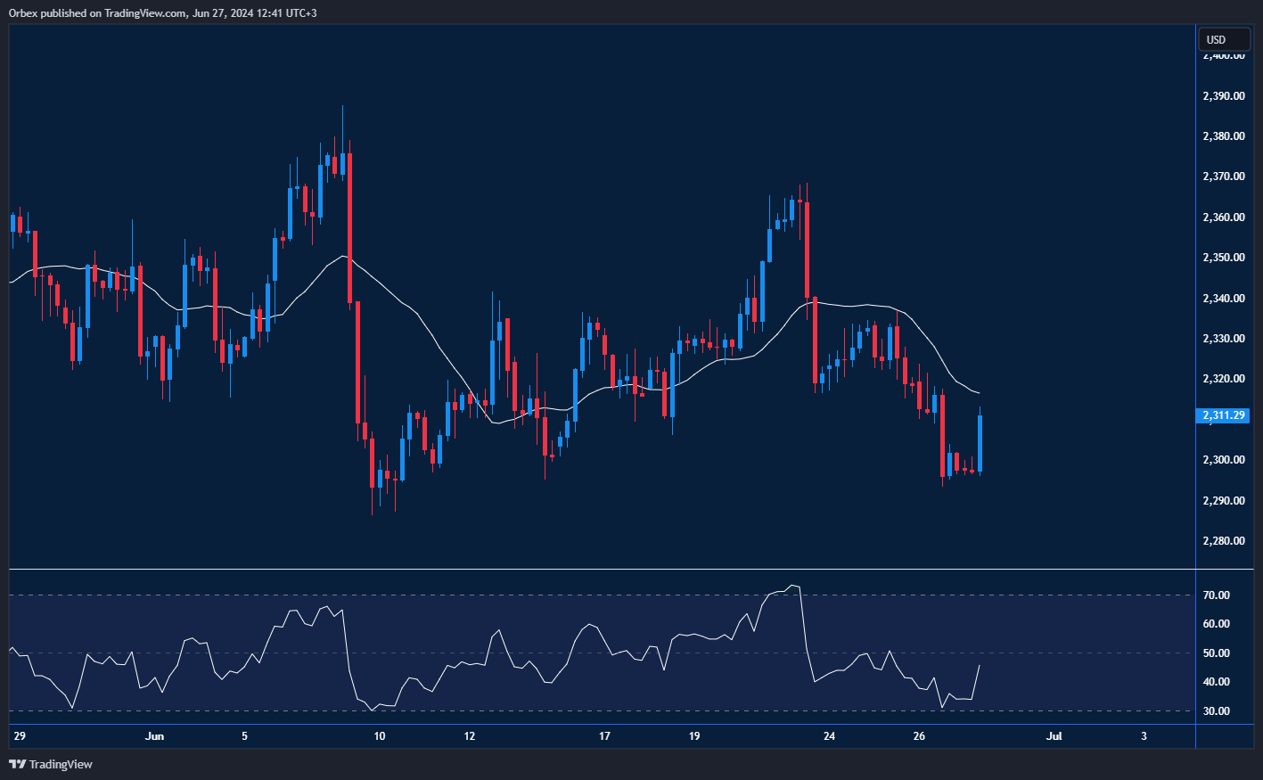 ارتفع الذهب قليلاً بعد أن جاءت بيانات إجمالي الناتج المحلي الأمريكي أقل من التوقعات، وهو بمثابة راحة مرحب بها للمتداولين حيث تجاوزت الأسعار مستوى 2300 مرة أخرى. فيما لا يزال سعر الذهب يعاني بعد فشله في الاحتفاظ بموقعه فوق 2360. وفي حال اختراقه أعلى 2330 – وهو النطاق الأعلى لقنوات تراكم الزخم السابق- فقد يعود المعدن النفيس إلى مساره الصحيح. وفي حال فشل هذا السيناريو، فإن الانخفاض إلى ما دون مستوى الدعم الجديد 2290 سيفتح الباب أمام وصول السعر إلى 2250.