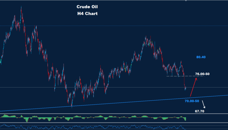 تمكن النفط الخام من الحفاظ على الانخفاض حيث تمكن من الوصول إلى منطقة الهدف 75.50 بينما تمكن من الاختراق تحتها ووصل إلى الهدف الثاني 73.50 وما دونه