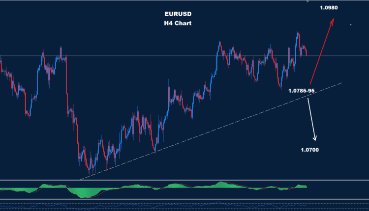 كما نرى على الرسم البياني فإن السوق يواجه منطقة دعم للترند الصاعد حول 95-1.0785 حيث طالما أن السوق يحتفظ بالتداولات فوقها فإن موجة التقدم قد تستمر نحو 1.0980 و1.1140