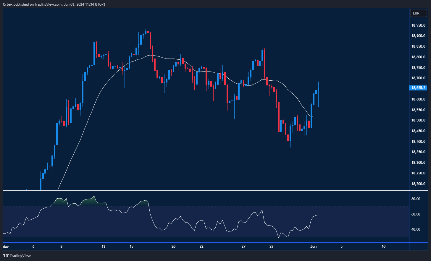 لا يزال مؤشر داكس في اتجاه هابط بعد أن تراجع من مستويات قياسية جديدة في الجلسات الأخيرة. ولكن الارتداد السريع من من القاع الأخير ١٨٣٧٠، قد أعاد المؤشر إلى المسار الصحيح. ومن شأن اختراق مستوى ١٨٨٠٠، أن ينهي مراكز البيع قصيرة الأجل ويجبر والبائعين على تغطية مراكزهم. ويمكن للمشترين توقع استمرار هذا الارتفاع مع آخر ارتداد لمؤشر القوة النسبية. ومع عودة مؤشر القوة النسبية للمنطقة المحايدة، يمثل ١٨٢٠٠ مستوى الدعم الأول، والمستوى النفسي ١٨٠٠٠ دعم رئيسي.