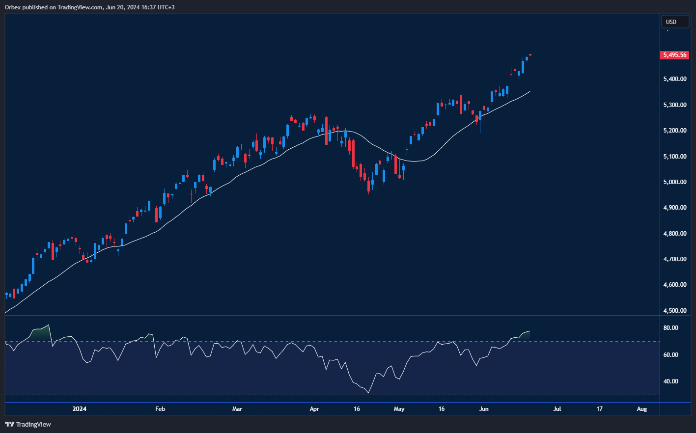 ارتفع مؤشر ستاندرد أند بورز 500 إلى مستويات عليا جديدة بفضل تواصل نمو الذكاء الاصطناعي في شركة إنفيديا وفي ضوء تفوقها علي مايكروسوفت كأكبر شركة من حيث القيمة في العالم، يبدو أنه لا توجد أي بوادر تشير إلى تباطؤ نموها مع استمرار المستثمرين في عمليات جني الأرباح. وعلى الرغم من أن كل ارتفاع قوي يصاحبه تصحيحاً، إلا أن كيفيته وتوقيته تظل غير معلومة ولا سيما مع دخول مؤشر القوة النسبية (RSI) إلى منطقة التشبع البيعي. وحتى ذلك الحين، يتجه المؤشر نحو 5600، ويعد 5350 مستوى دعم الأقرب للمؤشر.
