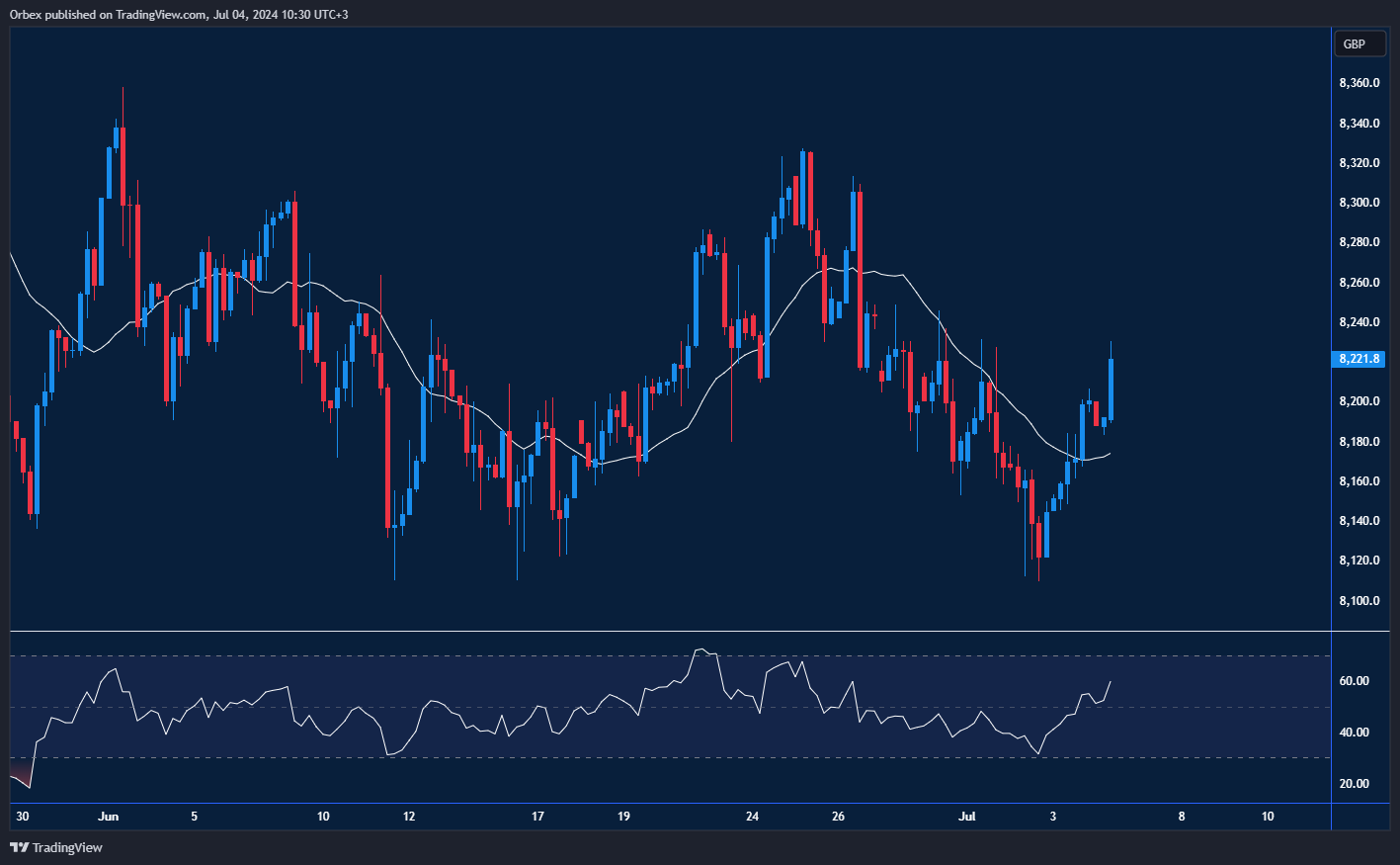 ارتفع مؤشر فوتسي 100 مستفيداً من الشائعات المبكرة التي تفيد بأن الحكومة الجديدة سيتم انتخابها اليوم. وكانت قد انقلبت المعنويات بعد أن لامس المؤشر مستوى منخفضًا آخر عند 8110. فيما دفع ارتداد السعر فوق مستوى المقاومة الأول البالغ 8180 البائعين على المدى القصير إلى تغطية مراكزهم مما أدى إلى التقاط المشترين أنفاسهم. ويشكل مستوى 8280 عقبة مهمة يجب تجاوزها قبل أن يتمكن المؤشر من تحقيق تعافٍ أوسع نحو ذروة شهر يونيو عند 8340. كما يعد 8160 مستوى مهمًا للحفاظ على صحة الارتداد، وإلا فقد يؤدي التصحيح الأعمق إلى إرسال المؤشر إلى 7800.