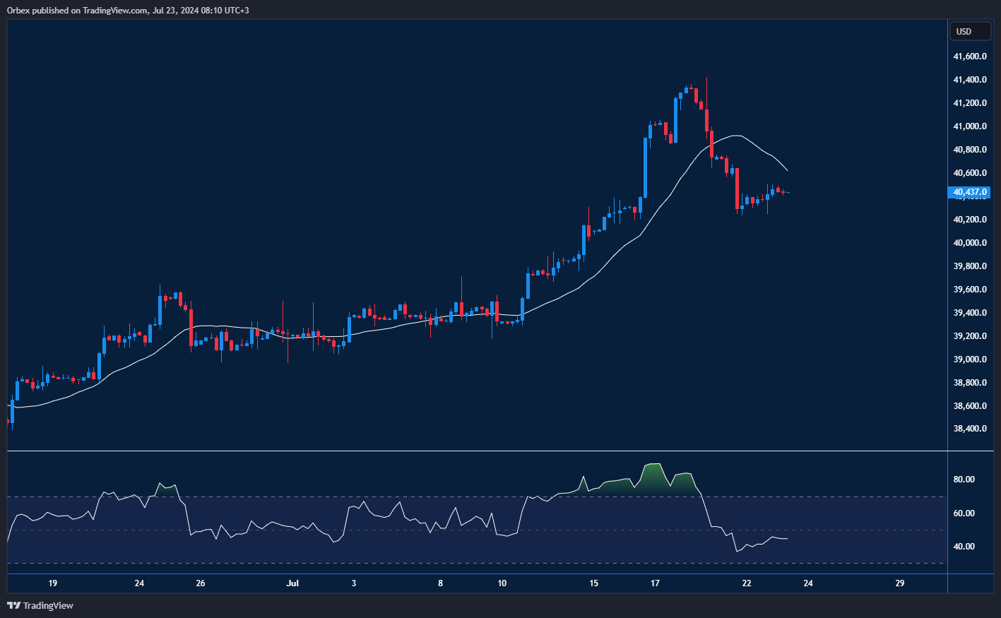 خفف مؤشر داو جونز 30 من مساره الهابط بعد موجة البيع الأخيرة. وبعد انخفاض وجيز، ساعد استقرار السعر فوق المستوى النفسي 40000 على استعادة المتداولين السيطرة على الاتجاه قصير الأجل. ويعد المستوى القياسي المرتفع فوق 41400 مقاومة حاسمة حيث قد يجني المتداولين بعض الأرباح. ويشكل 40100 أقرب دعم عندما يتجه مؤشر القوة النسبية إلى منطقة التشبع الشرائي، وقد يرى المشترون أن الانخفاض المحدود في سعر المؤشر هي فرصة للاستثمار.