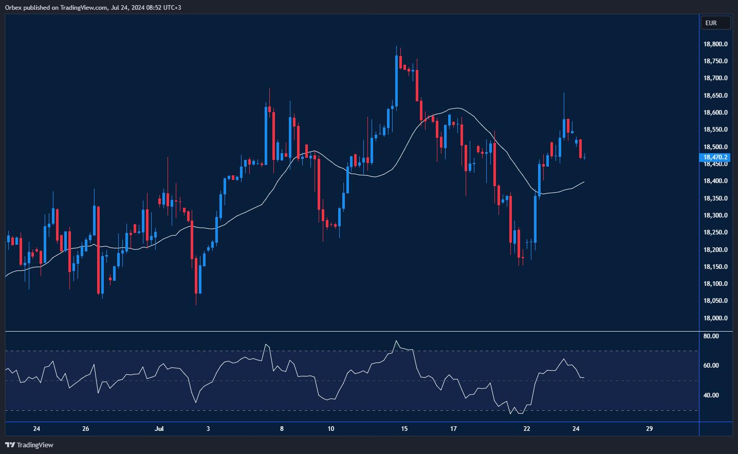 استمر تقلب مؤشر داكس40 بعد ارتفاعه مرة أخرى من منطقة 18000 السفلية. كما استمرّت حركته السعرية مستفيدًا من اختراقه أعلى المستوى النفسي 18500. بينما ينخفض مؤشر القوة النسبية (RSI) مرة أخرى إلى المنطقة المحايدة، حيث يشكل مستوى 18150 بالقرب من قاعدة الاختراق في منطقة الانطلاق في الاتجاه الصاعد أول مستوى يتوقع أن تتواصل عندها عروض الشراء، بينما يُعتبر مستوى 18000 دعما حرجا. وقد يحتاج إعادة اختبار آخر قمة للمؤشر عند 18750 إلى اختراق مستوى 18650 أولا من أجل تعاف كامل.