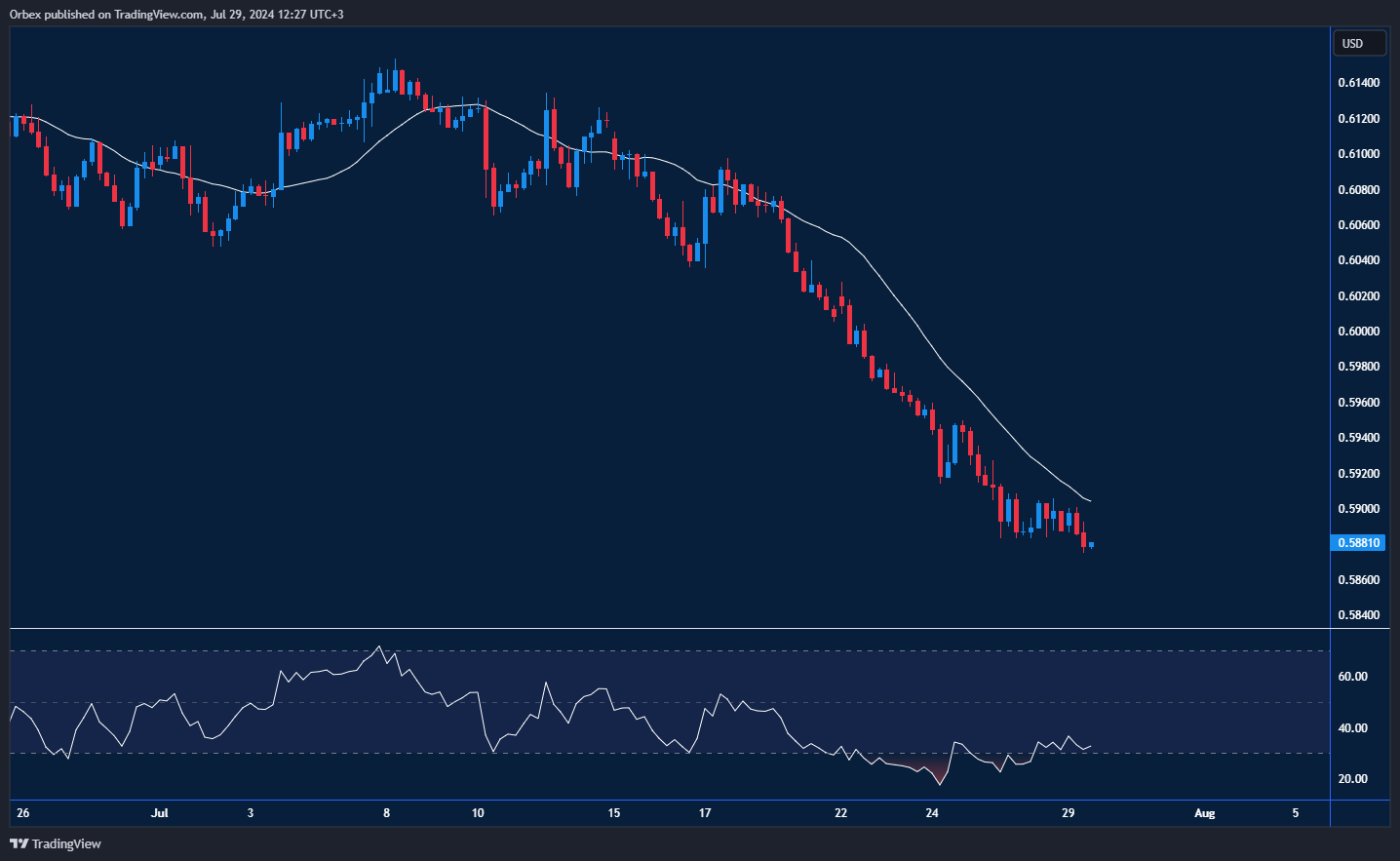 التقط الدولار النيوزيلندي أنفاسه قليلاً بعد هبوطه بأكثر من 300 نقطة ولكنه لا يزال تحت تأثير هبوطي قوي. أدى الارتفاع دون قمته السابقة عند 0.6080 إلى دفع المشترين لتغطية مراكزهم. وبعد فترة من التداول العرضي، يشكل 0.5950 العقبة الرئيسية أمام ارتفاع الزوج قبل أن يتمكن الزوج من التحرر من مساره التصحيحي، مما قد يفتح الباب أمام 0.6030. بدلاً من ذلك، أدى البيع الشديد إلى دفع الزوج دون 0.5880، مما أثّر بالسلب على أي أي زخم صعودي. هذا ويشكل 0.5800 مستوى دعم حرج، وقد تتأرجح حركة السعر مع ظهور نباعد صاعد على مؤشر القوة النسبية.