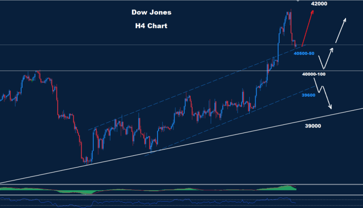 تمكن مؤشر داو جونز من إضافة المزيد من حركة الهبوط حيث تمكن من الاختراق دون الدعم الأول 50-40500 بينما لا يزال السوق يواجه الدعم الثاني حول منطقة 100-40000