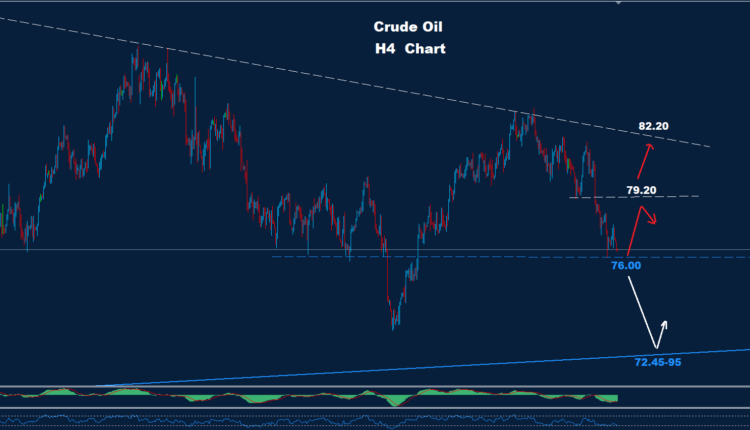 كما نرى على الرسم البياني، لا يزال السوق يحتفظ بالتداولات فوق مستوى الدعم 76.00 على الرغم من أن السوق قد سجل انخفاضًا طفيفًا عنه أمس، حيث طالما استمر السوق في الاحتفاظ بالتداولات فوق هذا المستوى، فقد تتاح فرصة لتصحيح ارتدادي نحو مستوى المقاومة 79.20