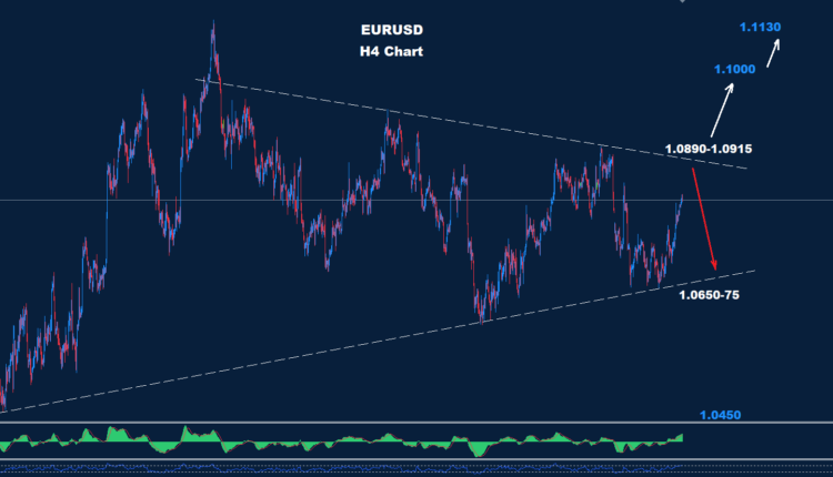 السوق يواجه ترند مقاومة لنموذج المثلث التداولي حول 1.0890-1.0915 والذي بدأ السوق اختباره الأسبوع الماضي