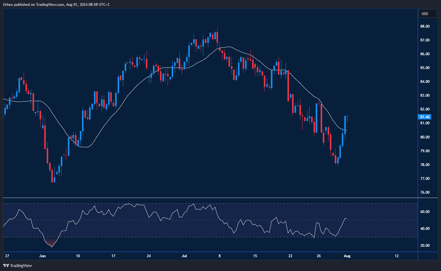 ارتفعت أسعار النفط خوفًا من تنامي الصراع في الشرق الأوسط. مع وجود معظم احتياطيات النفط العالمية، تزداد مخاطر الإمدادات يومًا بعد يوم. تستمر الأسعار في التقلب، وهناك مخاوف بشأن معدل الطلب الصيني حيث تواجه تباطؤًا في التعافي الاقتصادي. بالإضافة إلى ذلك، مع إشارة الاحتياطي الفيدرالي إلى خفض أسعار الفائدة في سبتمبر، قد يدعم هذا القرار النشاط الاقتصادي، مما يؤدي إلى زيادة في طلب النفط. قد يؤدي تزايد حالة التفاؤل إلى تغطية المراكز الشراء نحو 85.00، مع تشكيل مستوى 77.50 دعما جديد.