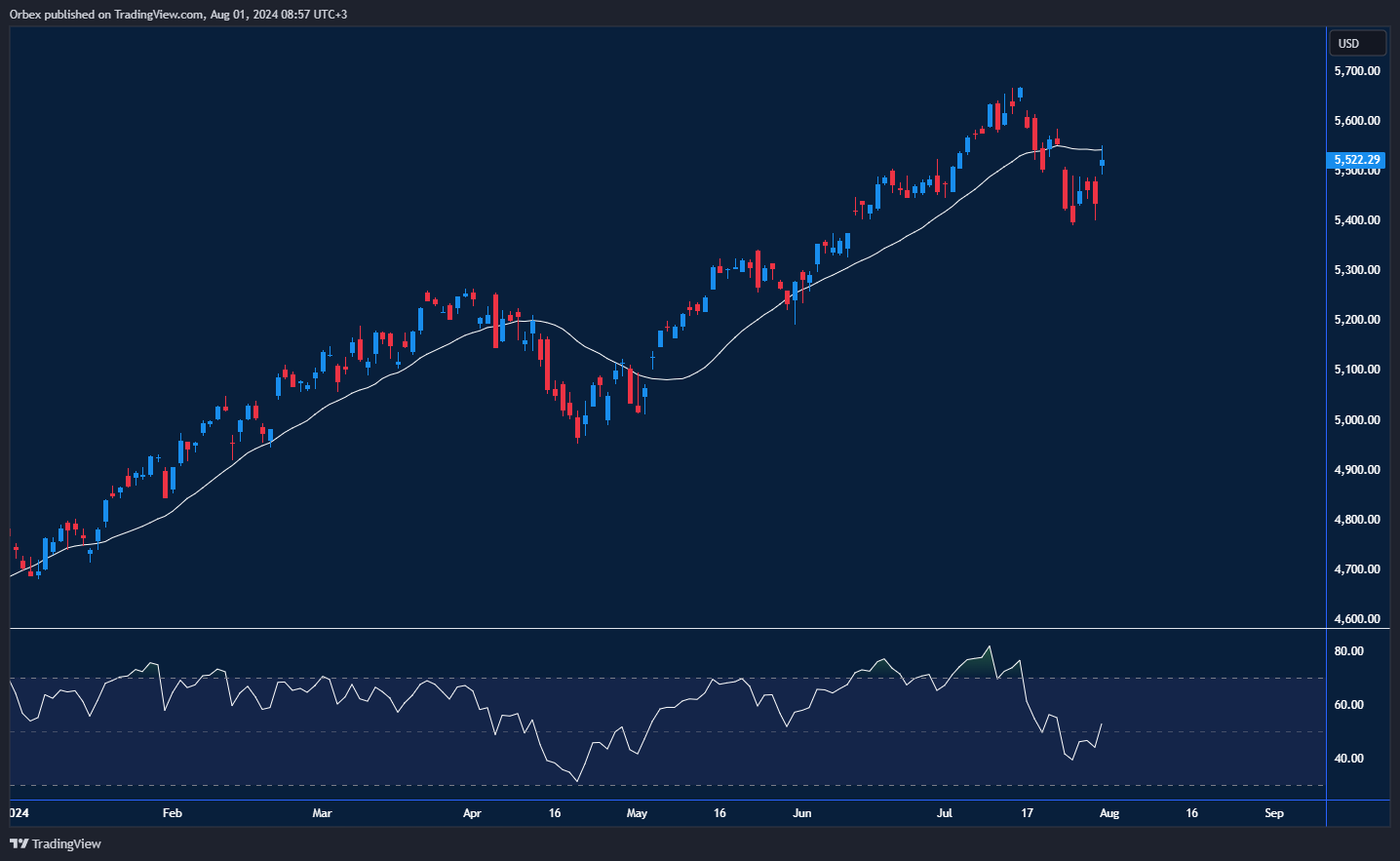 ارتفع مؤشر ستاندرد آند بورز بعد أن أبقى الاحتياطي الفيدرالي أسعار الفائدة دون تغيير مع تسليط الضوء على تقدمه في حربه ضد التضخم. شهد المؤشر أفضل جلسة له منذ فبراير الماضي الأسبوع الماضي عند صدور الخبر، حيث يبدو أن حركة الأسعار تعود إلى المسار الصحيح. كما أنه قد يكون مهيأ للتحرك إذا استمرت البيانات في منح البنك المركزي الثقة بأن التضخم يتباطأ. وقد أدى ذلك إلى تغيير كبير في المزاج العام حيث استمر التفاؤل بشأن التعافي الأوسع. ويبدو المؤشر متجهاً صوب مستوى 5600، مع تشكيل مستوى 5380 أول دعم له.