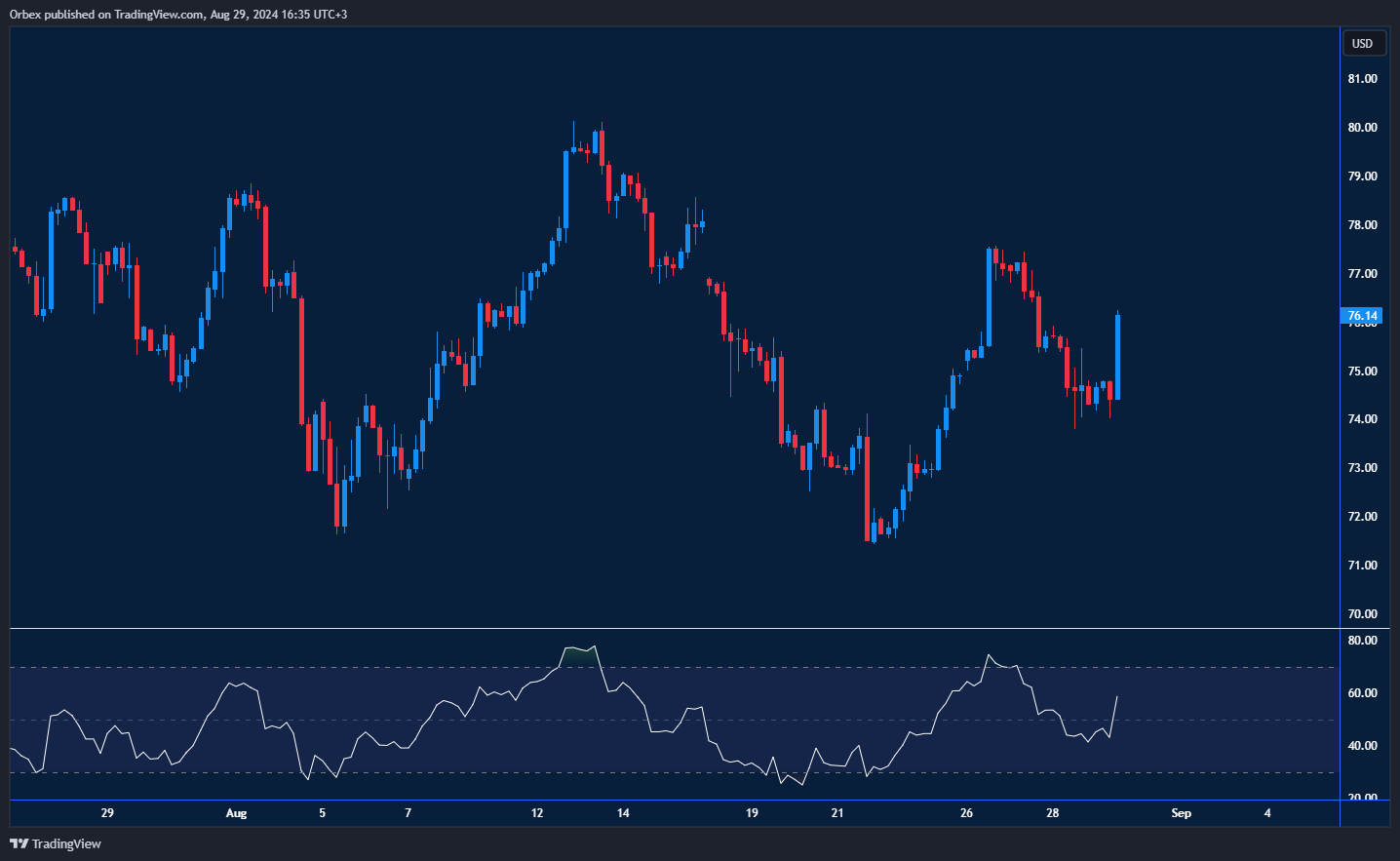 خام غرب تكساس (WTI): تعافي خام غرب تكساس الوسيط مع دعم عند 74.00 ومقاومة عند 76.15.