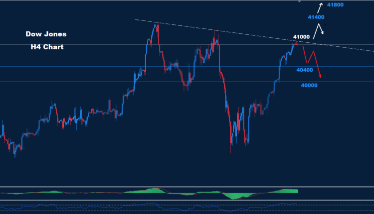 تمكن مؤشر داو جونز من الوصول إلى منطقة الهدف 900-40800 بينما السوق الآن معرضة لخطر التصحيح الهبوطي الذي قد يضرب نحو مستويات 40400 و 40000