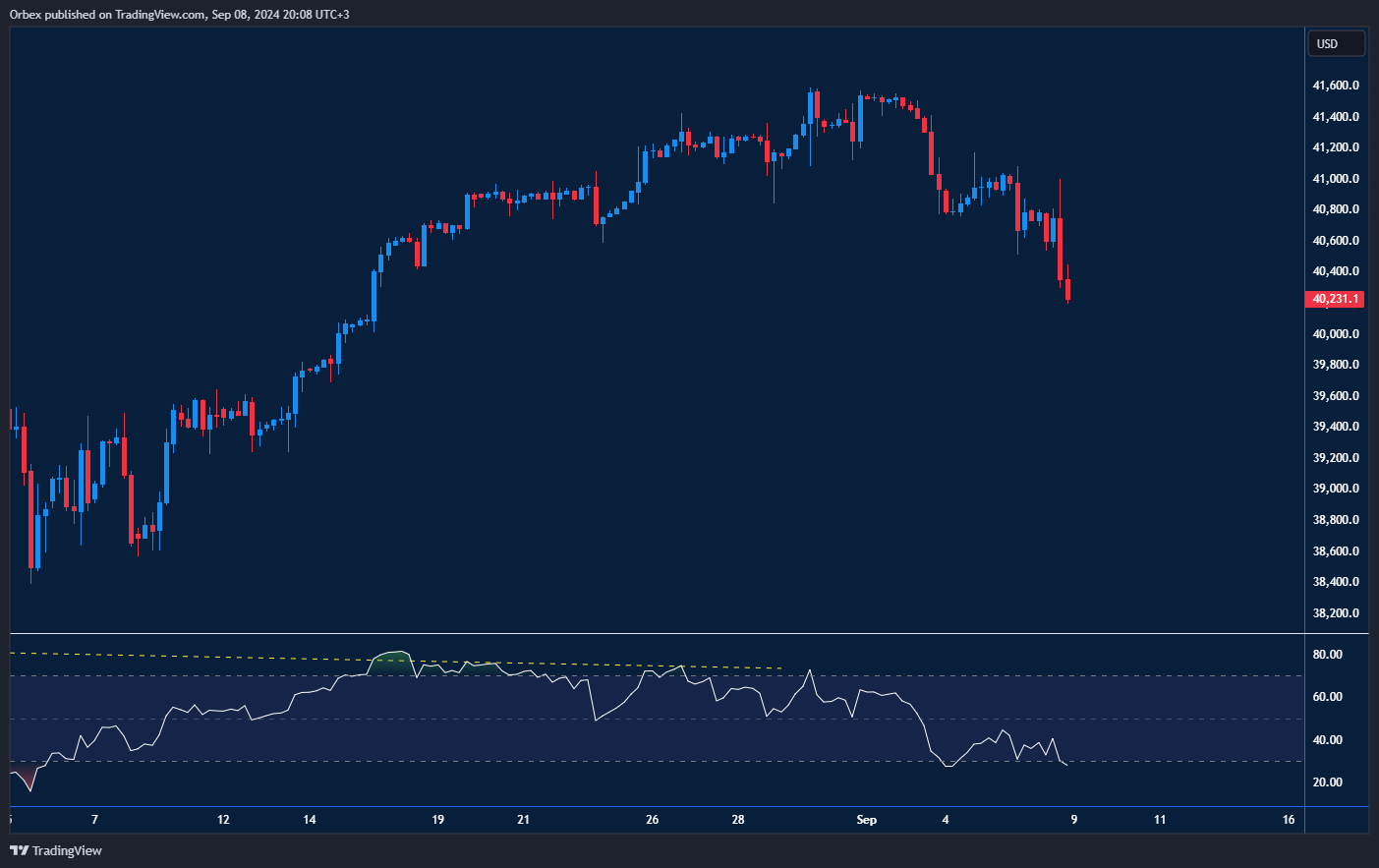 تراجع مؤشر الداو 30 بعد تقييم المستثمرين لتداعيات تقرير الوظائف الضعيف. ويوضح الرسم البياني تراجع السعر نحو مستوى ٤٠٠٠٠، وسلسلة من القيعان الأدنى مع صعود محدود تشير إلى أن المشترين قلصوا من تعرضهم للسوق. ومع بقاء مؤشر القوة النسبية في منطقة ذروة البيع، فإن مستوى ٤١٠٠٠ هو النقطة التي يجب مراقبتها لمعرفة ما إذا كان المشترون سيعودون. هذا ويمثل المستوى ٤٠٦٠٠ مقاومة جديدة في حالة حدوث الارتداد حيث يترقب المتداولون بيانات التضخم التي ستصدر هذا الأسبوع.