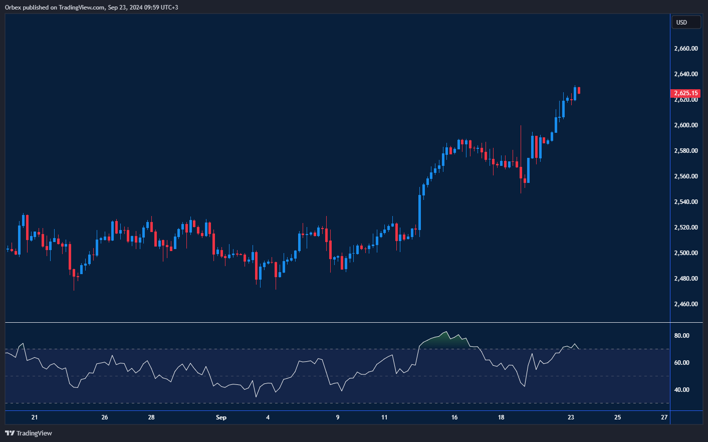 ارتفع سعر الذهب مع تصاعد التوترات العالمية التي دفعت المتداولين نحو الملاذ الآمن. ويواصل المعدن الثمين ببطء تجاوز مستويات مقاومة بين 2615 و2625. وبينما أصبح جانب البيع أكثر حذرًا، إلا انه ربما لم ينتهِ بعد من محاولاته للتأثير على الأسعار. وحيث يمثل مستوى 2635 عقبة رئيسية، فإن اختراقه قد يؤدي إلى ارتفاع السعر نحو 2700. ومع ذلك، فإن الانخفاض الأولي دون 2610 قد يشير إلى عمليات جني أرباح، وربما يؤدي التباين السلبي في مؤشر القوة النسبية إلى مرحلة من التوطيد. وسيكون أقرب دعم في حالة حدوث ذلك عند 2600.