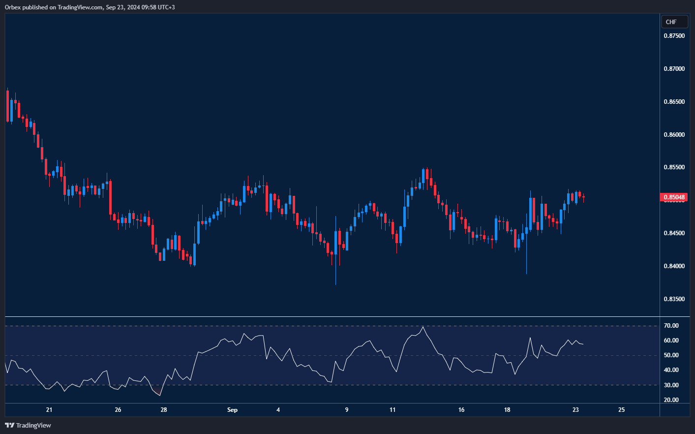 تراجع الفرنك السويسري بعد أن فقد بعضاً من قوته أمام الدولار الأمريكي. وهناك إشارات على الرسم البياني تدل على تحسن المعنويات رغم الارتفاع المؤقت نحو 0.8400، والذي أدى إلى خروج المتداولين الأضعف من السوق. وقد يفتح إغلاق الزوج أعلى مستوى 0.8500 المجال للوصول إلى القمة السابقة عند 0.8550، مع استهداف 0.8610 كهدف وسطي. هذا ويمثل مستوى 0.8440 حيث قاعدة آخر اختراق أول مستوى دعم.