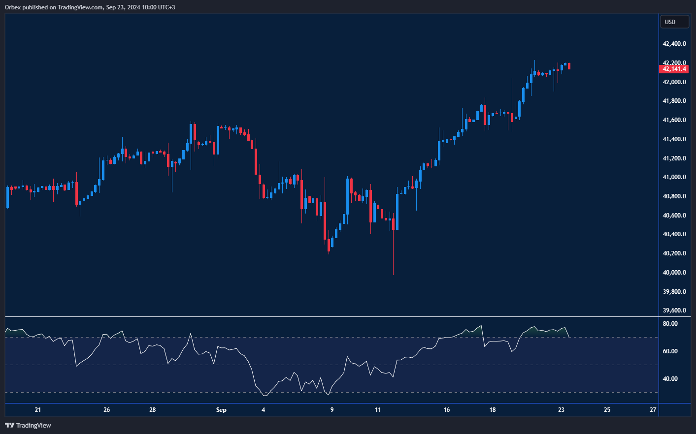 حققت المؤشرات مزيد من المكاسب بعد تلقي إشارات ايجابية من الاحتياطي الفيدرالي الذي قرر أخيرًا تيسير سياسته النقدية. واستفاد السعر من ارتداده من مستوى 42000، مما يشير إلى أن السوق بدأ في التفاؤل مجددًا. ومع محاولة المشترين دفع السعر أعلى مستوى 42100، فإذا ما نجحوا في ذلك، سيواجه البائعون صعوبة في الدفاع عن مستوى 43350، وهو مستوى المقاومة الأخير. وفيما يمثل مستوى 41600 عند قاعدة الزخم الأخير دعمًا جديدًا، يعتبر 41250 مستوى حرجًا يتعين صموده للحفاظ على هذا الارتداد قائمًا.التقارير المترجمة من مدونة أوربكس الانجليزية