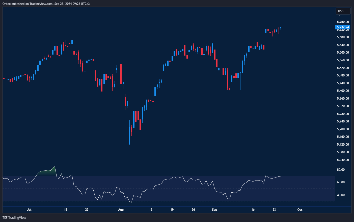 أغلق مؤشر ستاندرد أند بورز 500 عند مستوى قياسي جديد مع استمرار الأسهم في استيعاب خفض الفائدة الذي أقره الاحتياطي الفيدرالي الأسبوع الماضي. وقد واجه الارتفاع الحالي بعض التوطيد عند مستوى 5730. ويظهر مؤشر القوة النسبية إشارات سلبية قد تدل على تراجع في زخم الصعود، مما يوحي بأن بعض المشترين اليوميين قد قاموا بجني الأرباح. ويسعى المؤشر إلى تأمين دعم عند مستوى 5650، وهو القاعدة التي انطلق منها الارتفاع الأخير، حيث من المتوقع أن يعود المشترون للانخراط في السوق عند هذا المستوى، مما قد يؤدي إلى ارتفاع الأسعار مجددًا. وفي حالة حدوث ارتداد، فإن مستوى المقاومة الأول سيكون عند 5760.