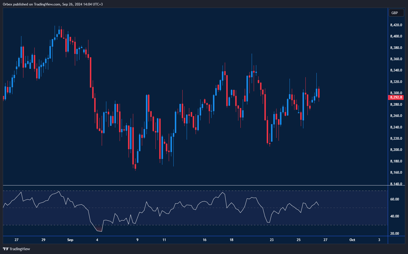 يواصل مؤشر فوتسي100 التحرك بشكل عرضي، حيث ترك الاتجاه الأخير المتداولين في حالة من عدم اليقين. وبعد إغلاق حذر فوق مستوى المقاومة الحاسم عند 8300، يبدو أن المؤشر واجه بعض المقاومة قرب مستوى 8340، مع تباين مؤشر القوة النسبية الذي يشير إلى تباطؤ محتمل في الزخم. وإذا تمكن المؤشر من الإغلاق أعلى مستوى 8380، فقد يؤدي ذلك إلى ارتفاع الأسعار بشكل أكبر. وبخلاف ذلك، قد ينخفض السعر مجددًا نحو مستوى 8200، مما يعني استمرار الاتجاه المتذبذب.