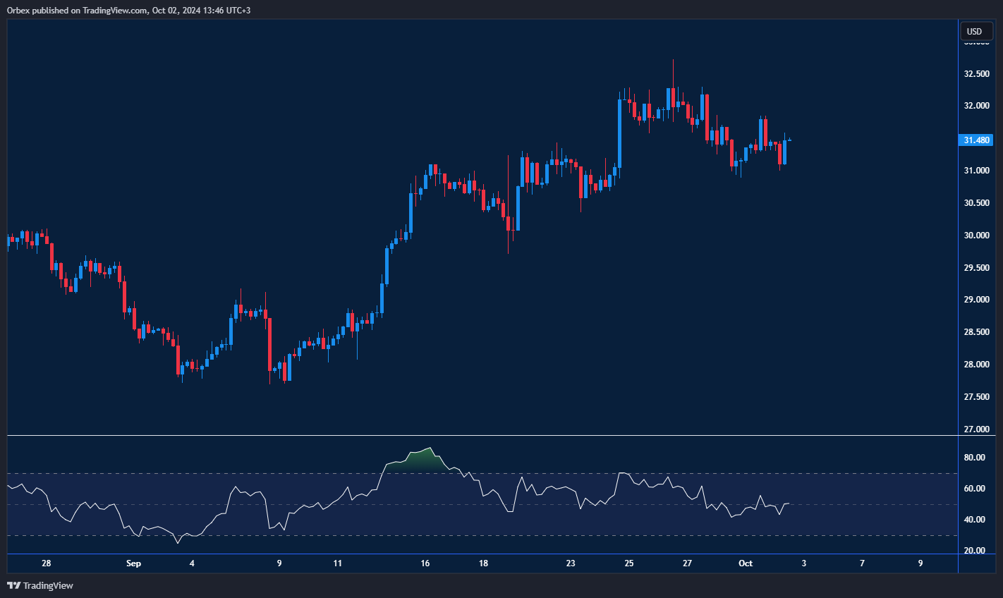 تتراجع أسعار الفضة عن ذروتها الأخيرة، بينما يراقب البائعون بعناية احتمال حدوث تصحيح. تتداول الفضة حاليًا فوق مستوى القاع المزدوج اليومي عند 31.00، الذي يُعتبر مستوى حاسمًا للحفاظ على استقرار سعر المعدن الثمين. في حال ارتفع السعر فوق 31.60، فسوف يتراجع الضغط السلبي نتيجة تصفية مراكز البيع قصيرة الأجل. ستكون الخطوة التالية حاسمة في تحديد اتجاه التعافي المحتمل. كما أن بقاء مستوى الدعم الأول عند 30.50 أمر ضروري للحفاظ على الزخم الإيجابي، خاصة في ظل تراجع مؤشر القوة النسبية.