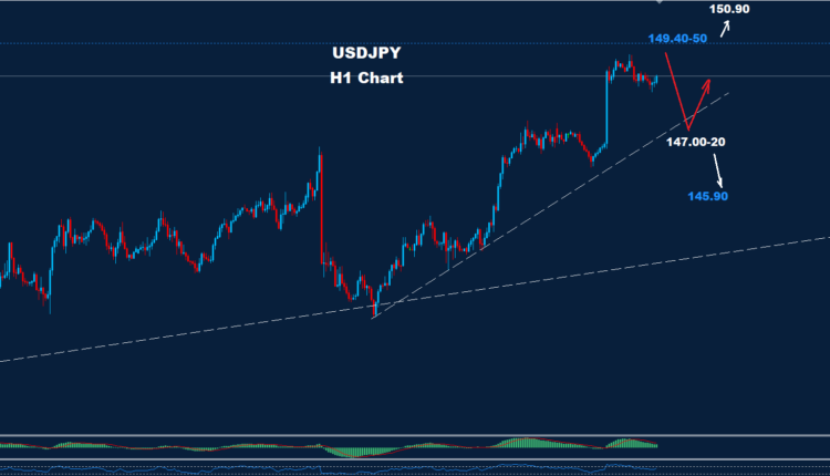تمكن زوج الدولار الأمريكي مقابل الين الياباني من اختراق مستوى المقاومة 147.20 يوم الجمعة الماضي، كما تمكن السوق من تسجيل أعلى مستوى عند 149.11 مقتربا عند الهدف 149.40 كما نرى على الرسم البياني للمدى اليومي، لا يزال السوق يواجه مقاومة عند 50-149.40 مما قد يدفعه إلى تصحيح هبوطي نحو 148.00 و 20-147.00 فوق 149.50 قد يضرب المزيد من التقدم السوق نحو منطقة 151.25-150.90
