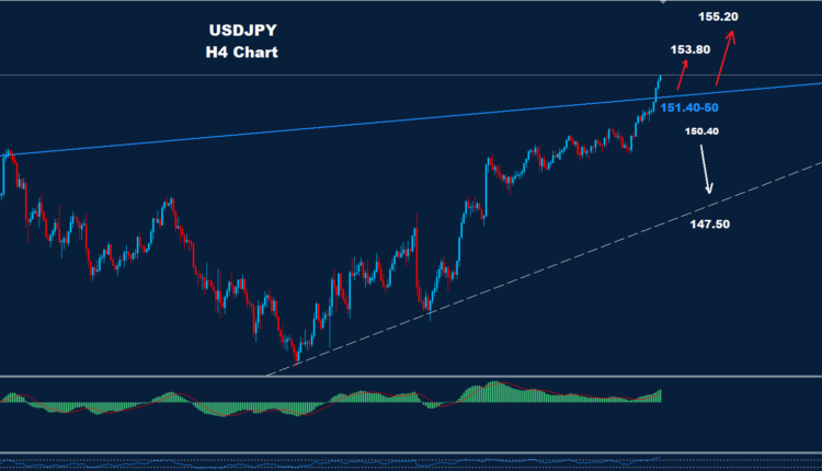 تمكن زوج الدولار الأمريكي مقابل الين الياباني من اختبار منطقة الدعم 50-151.40 يوم الجمعة الماضي، بينما تمكن من الارتداد نحو الهدف 153.80