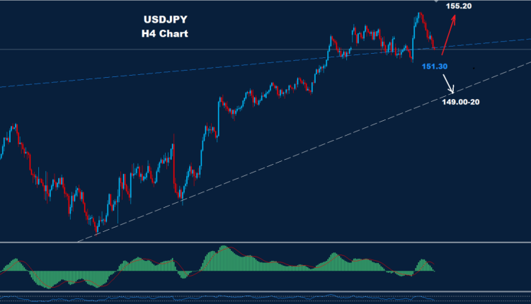 لا يزال زوج الدولار الأمريكي/الين الياباني متمسكًا بموجة الاتجاه الصاعد حيث تمكن من الوصول إلى أعلى مستوى عند 154.70 قبل يومين كما نرى على الرسم البياني، لا يزال السوق يواجه منطقة الدعم 50-151.30 ، حيث طالما استمر السوق في الاحتفاظ بالتداولات فوقها، فقد تتوسع موجة التقدم نحو 155.20 و157.80 قد يتعرض السوق لمزيد من الانخفاض تحت 151.30 لاختبار دعم الترند حول منطقة 20-149.00